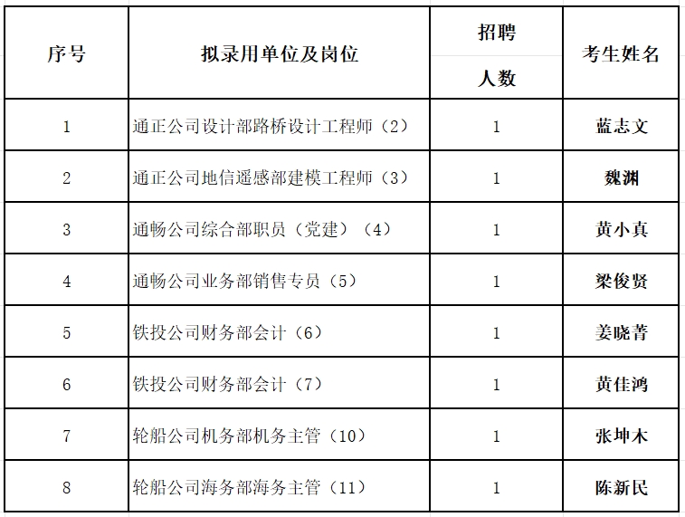 根據(jù)《漳州市交通發(fā)展集團(tuán)有限公司2023年“人才漳州月”赴外公開招聘公告》的相關(guān)規(guī)定,經(jīng)資格審查、初面、復(fù)面、體檢、政審等程序,現(xiàn)將擬錄用8名人員予以公示,公示時(shí)間為2024年1月19日至2024年1月25日(五個(gè)工作日)。公示期間歡迎群眾來電、來信、來訪反映情況。