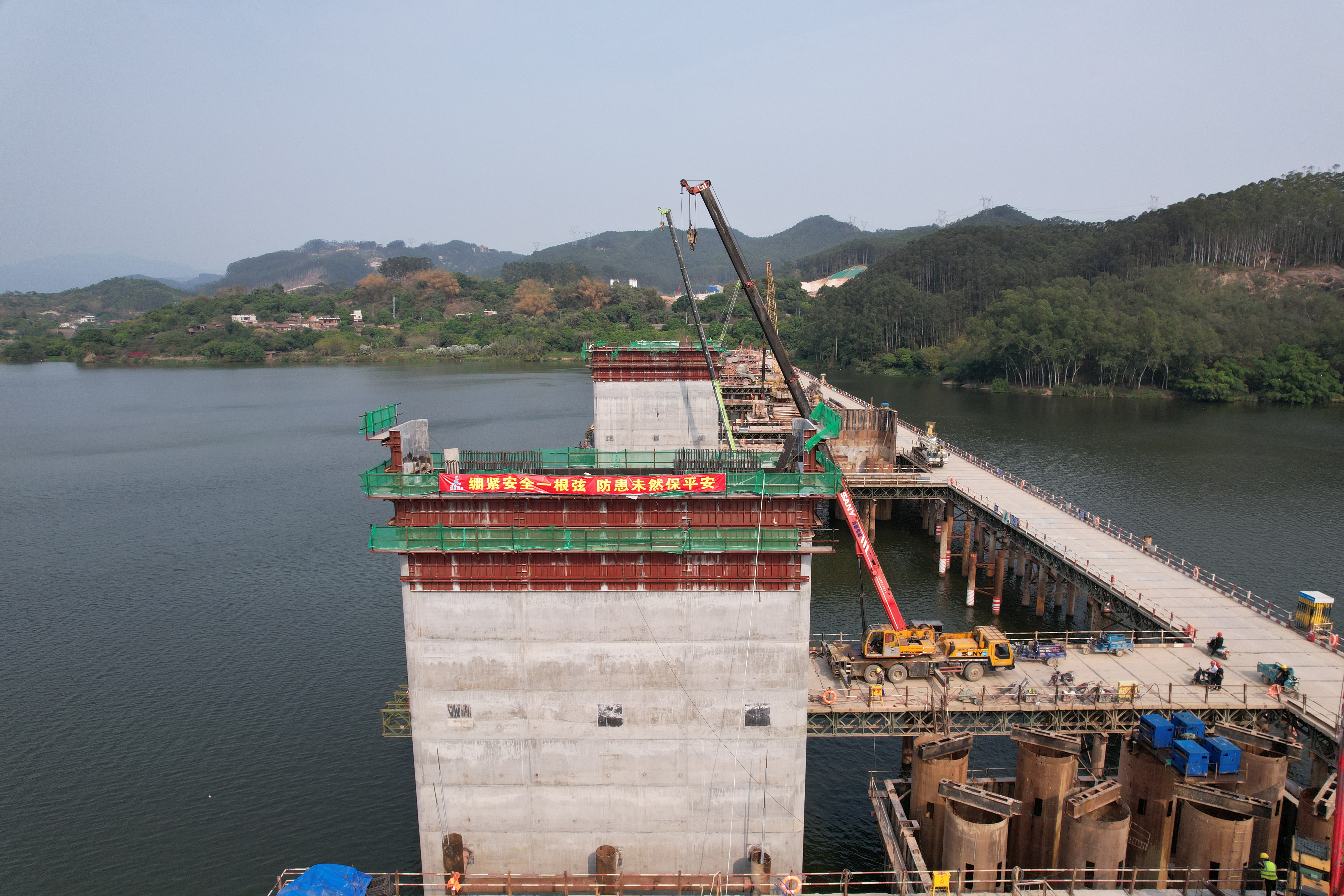 漳濱特大橋全長1899.5米,主橋為11#-14#墩,上跨九龍江北溪,設計采用(45+80+45)m懸澆梁,此次完成澆筑的主橋主跨右幅12#、13#主墩墩身采用翻模施工。為保證主橋墩身澆筑質(zhì)量,項目部提前謀劃、科學組織,制定詳細的專項施工方案,并對施工人員配備、機械配置、安全管控等方面做了周密安排,確保項目高標準、高質(zhì)量、高效率推進。