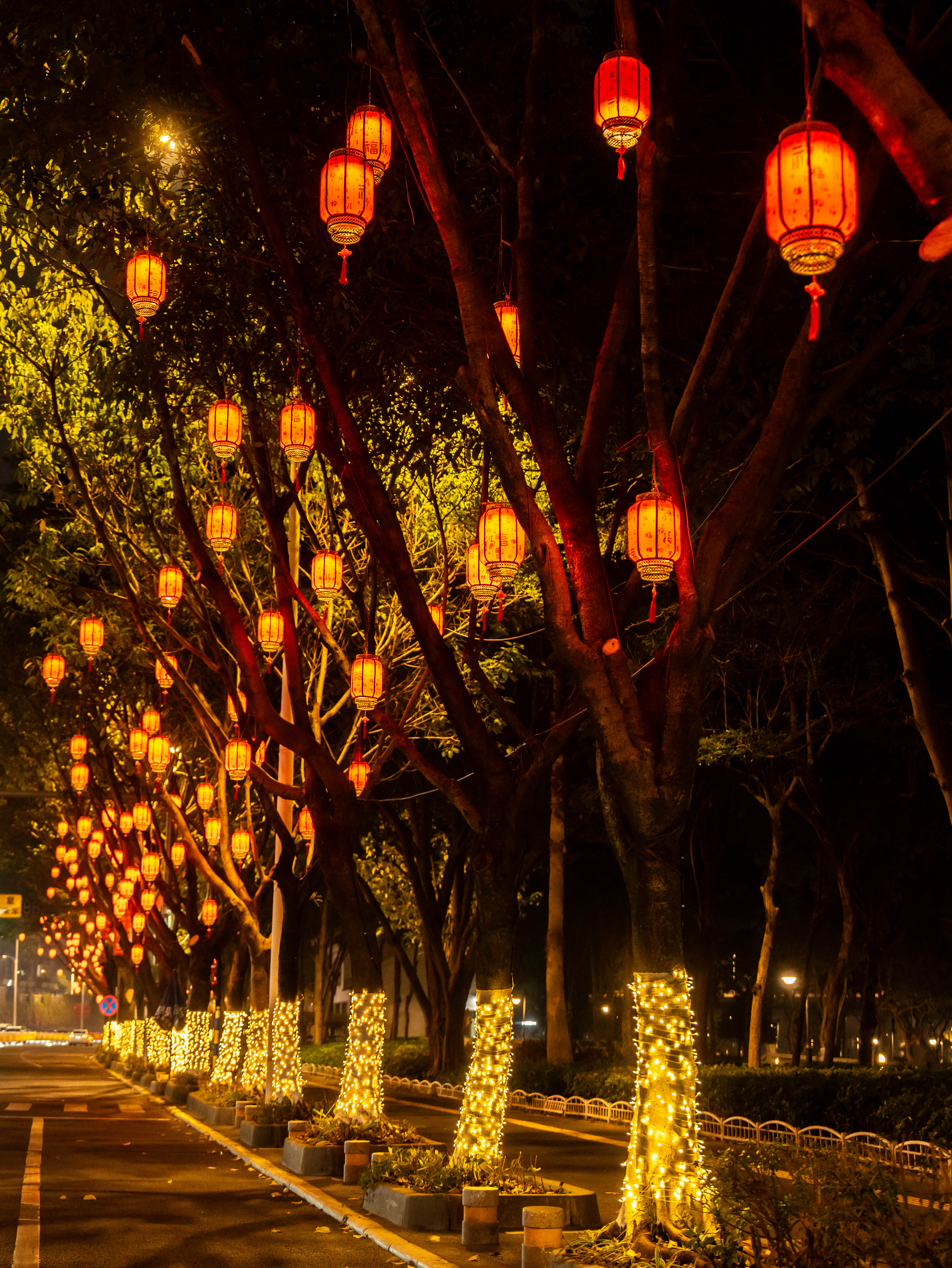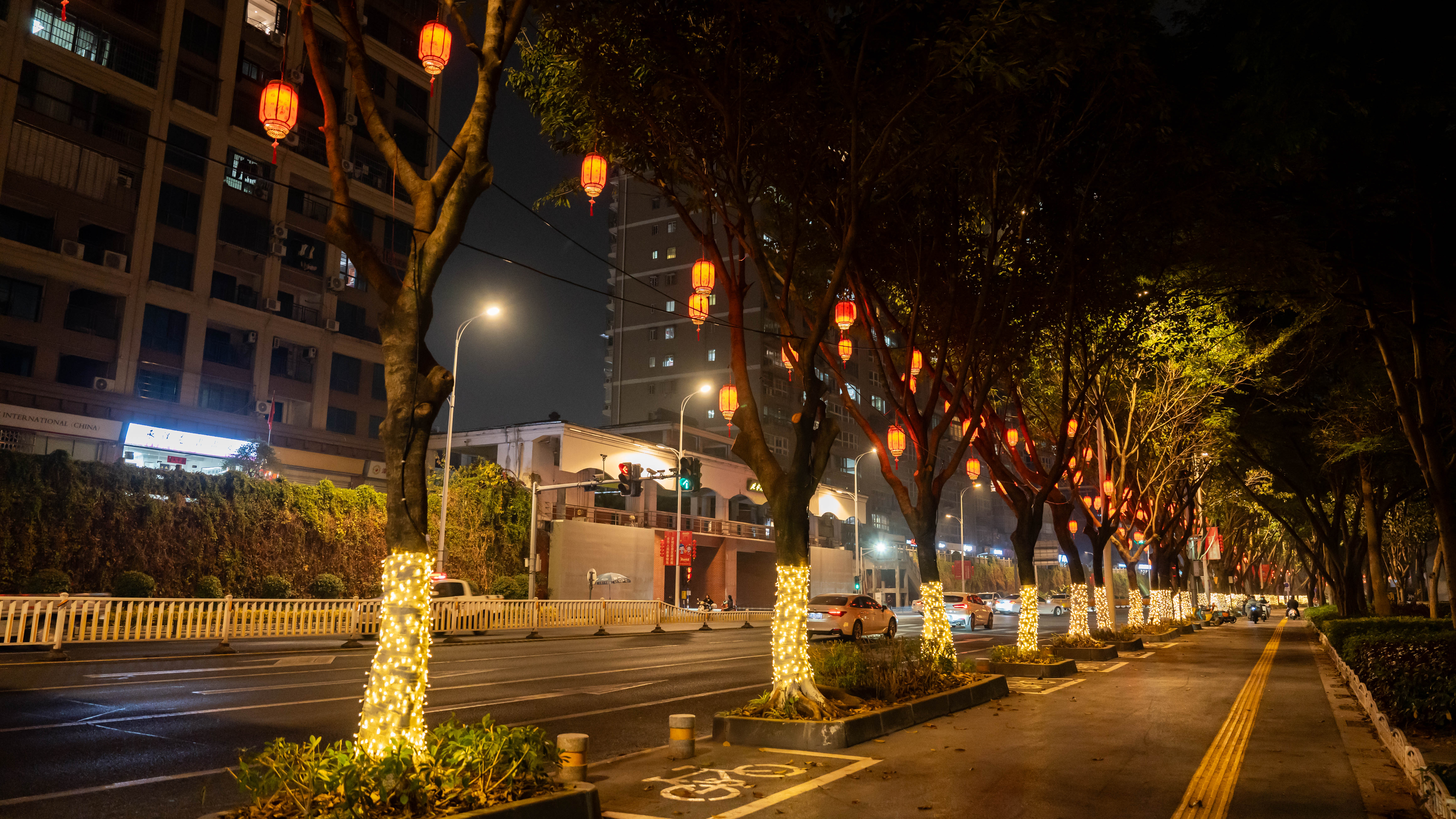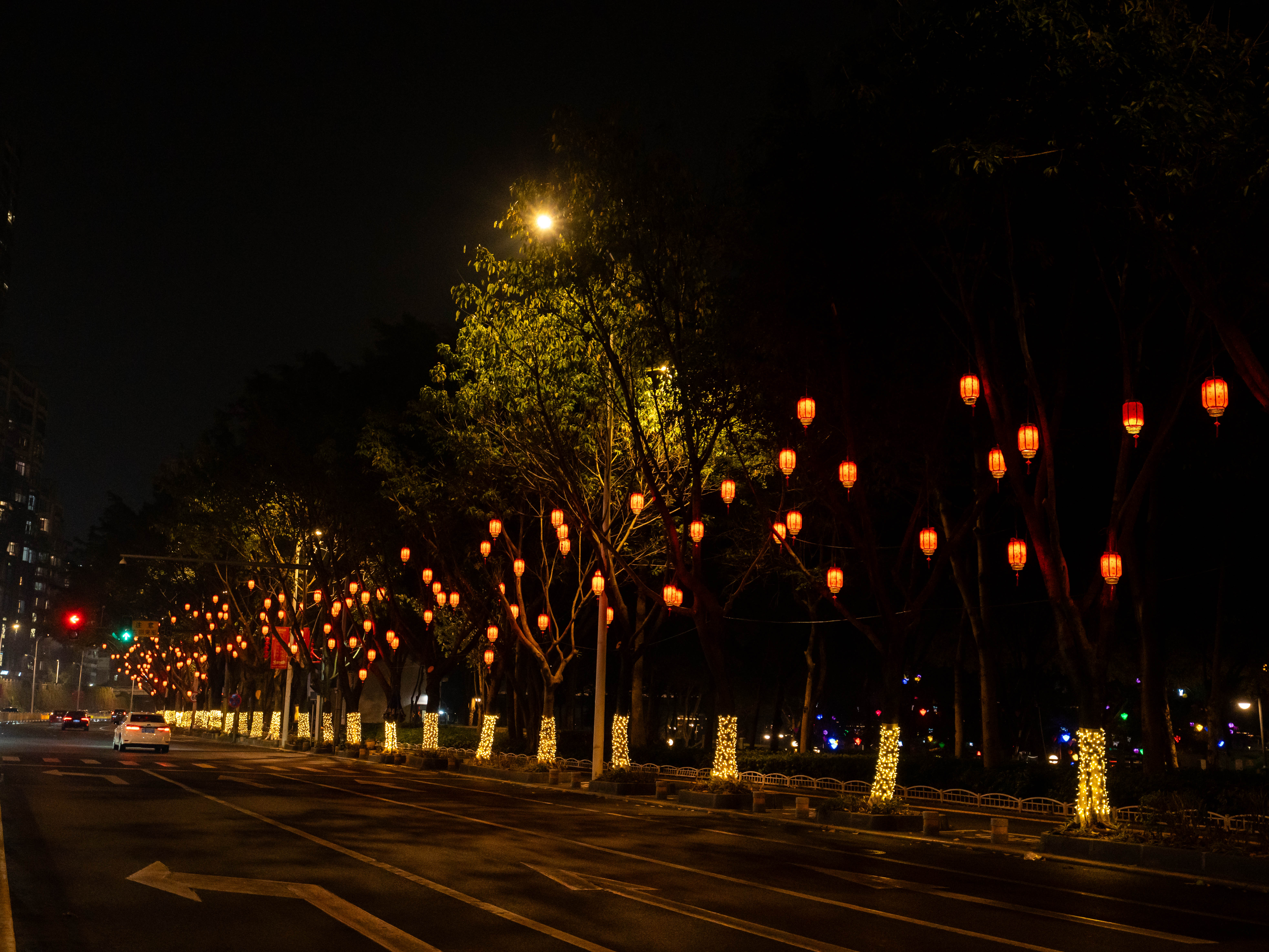 《鼓舞新春》(江濱路<戰(zhàn)備大橋-解放路閘門>)采用新中式燈籠結(jié)合滿天星樹燈,為江濱沿路的樹木披上光影華服,在技術(shù)賦能下構(gòu)筑了一條流動(dòng)的文化光譜,實(shí)現(xiàn)“一盞燈籠連接萬家燈火”,不僅給這一條城市主干道增添了一抹靚麗的風(fēng)景,更表達(dá)了對(duì)全市人民的美好祝愿。