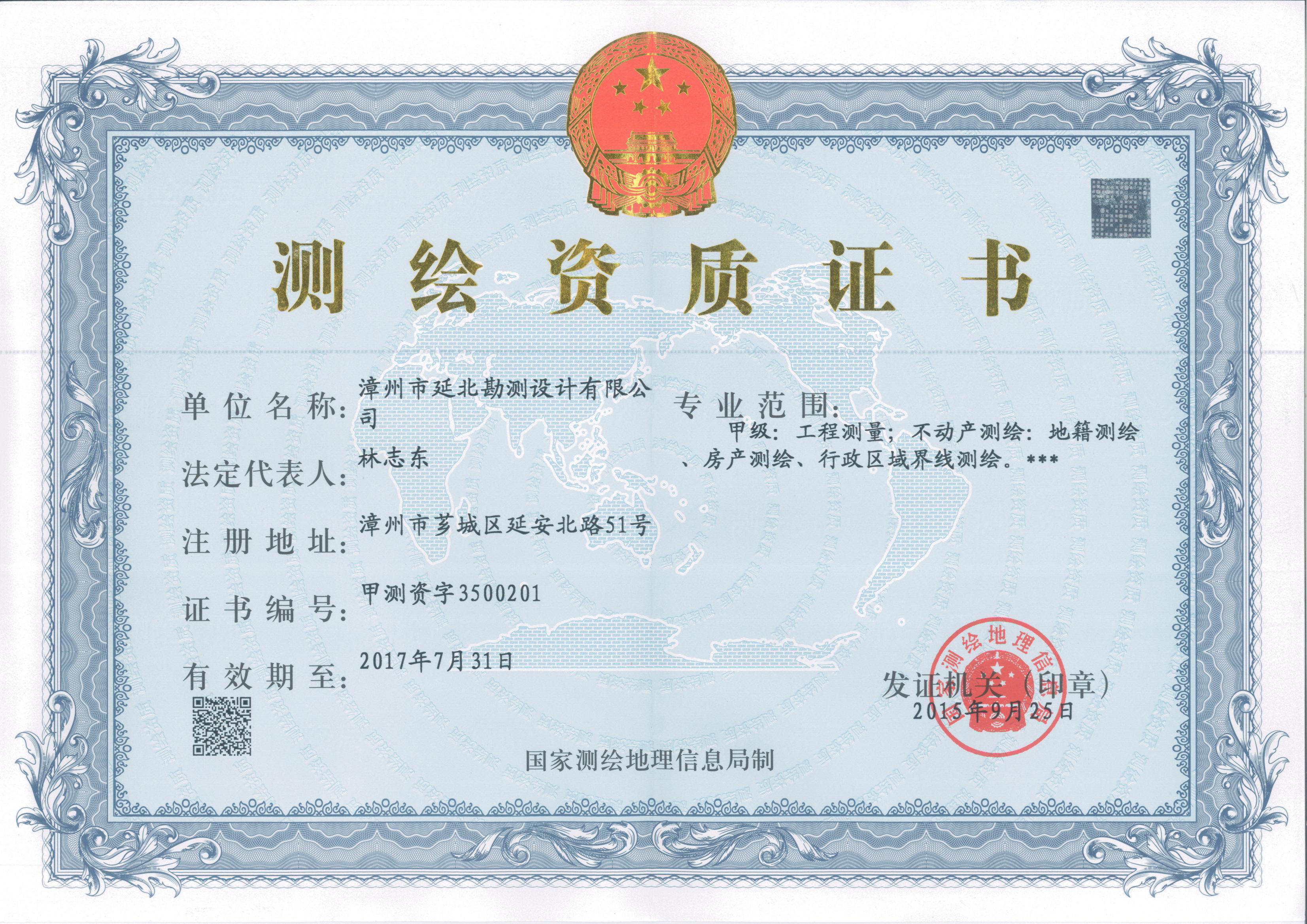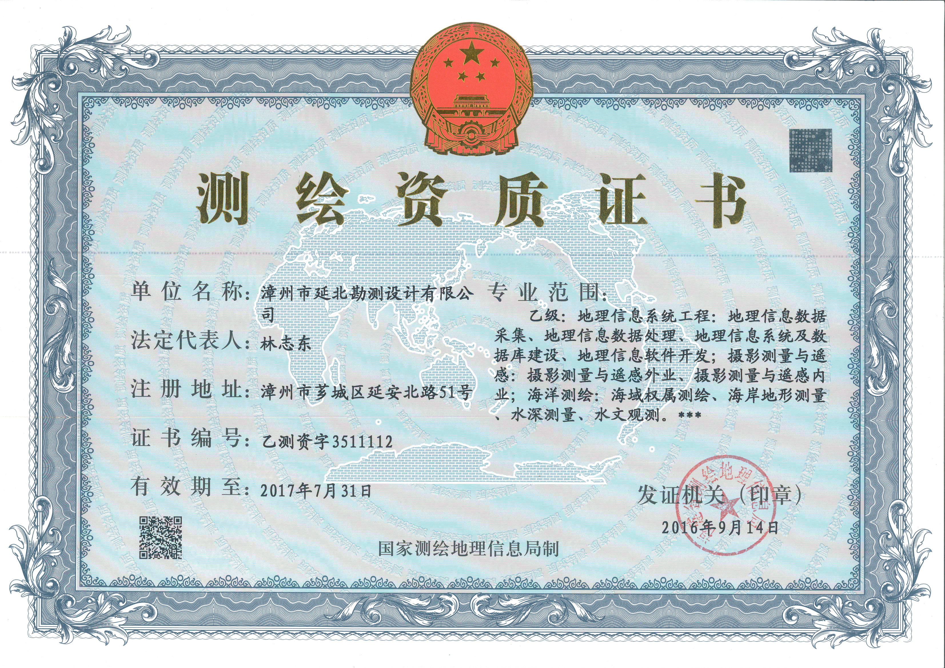 漳州通正勘測設(shè)計院有限公司為目前漳州唯一一家測繪甲級的國有企業(yè),在同行業(yè)中具備較強的竟爭力。為進一步拓展測繪業(yè)務(wù)范圍,不斷增強測繪綜合實力,通正設(shè)計院在去年測繪資質(zhì)升級為甲級資質(zhì)(工程測量、地籍測繪、房產(chǎn)測繪)的基礎(chǔ)上,積極努力地進行測繪資質(zhì)增項申報工作。經(jīng)福建省測繪地理信息局的嚴格審查,2016年9月,正式通對了通正設(shè)計院測繪資質(zhì)增項申請,批準了“攝影測量與遙感、海洋測繪”兩個增項為乙級資質(zhì)。